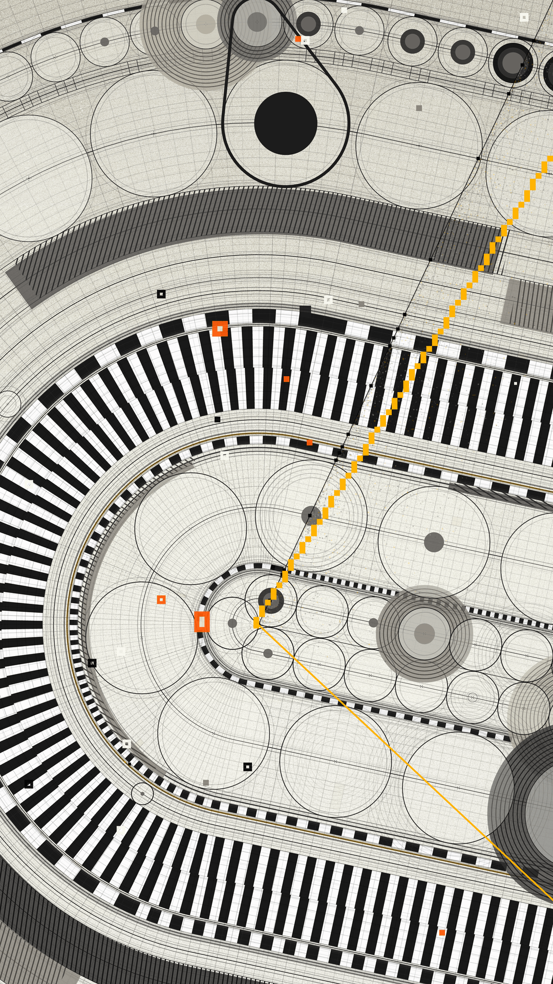 Visually, the work reveals its own construction. Lines, paths, and rotations expose an internal logic, like looking inside a mechanism. The drawing language recalls diagrams, technical sketches, or the interior of a mechanical watch. It is a system in motion, always active.