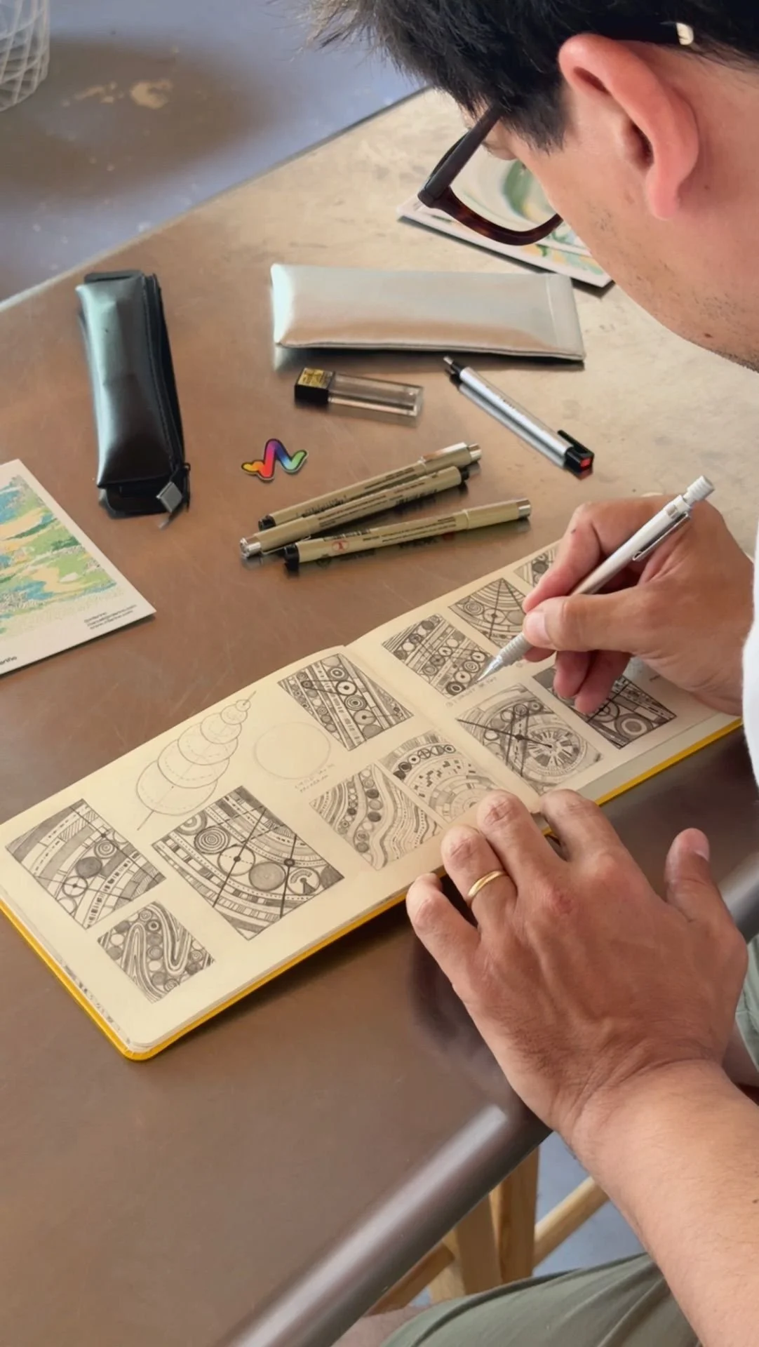 During the residency, I spent hours thinking, sketching, and making connections. Those connections are also visible. Elastic lines, like rubber bands, link elements across the piece, representing how memories connect, how one thought leads to another, and how everything builds over time. These same connections introduce moments where the system attempts to pull itself back, as if trying to regain control. But it never fully resets. It is not a loop. The movement continues, drifting forward, never returning to a fixed state.